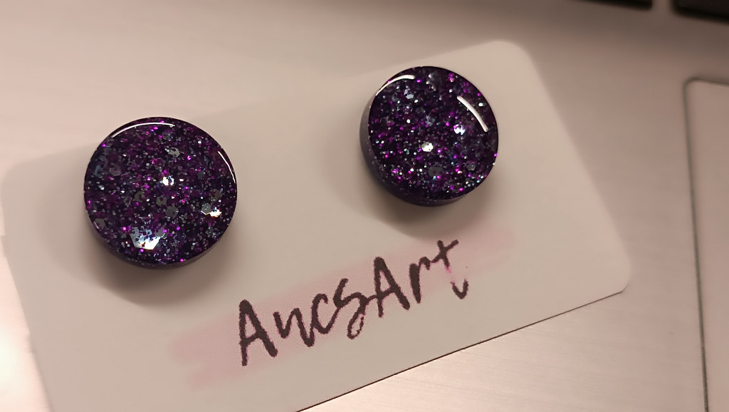 Csupalila és ezüst csillámló, nemesacél beszúrós szerelékkel készült fülbevaló.